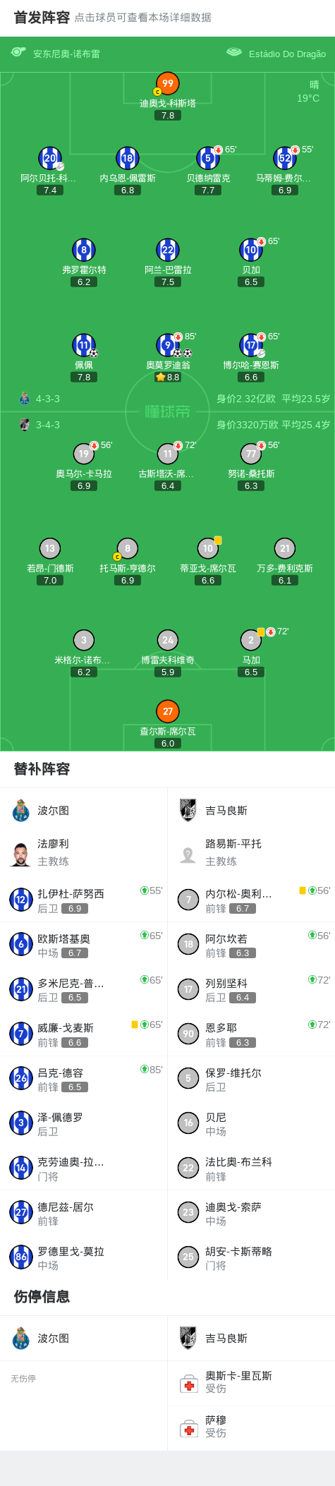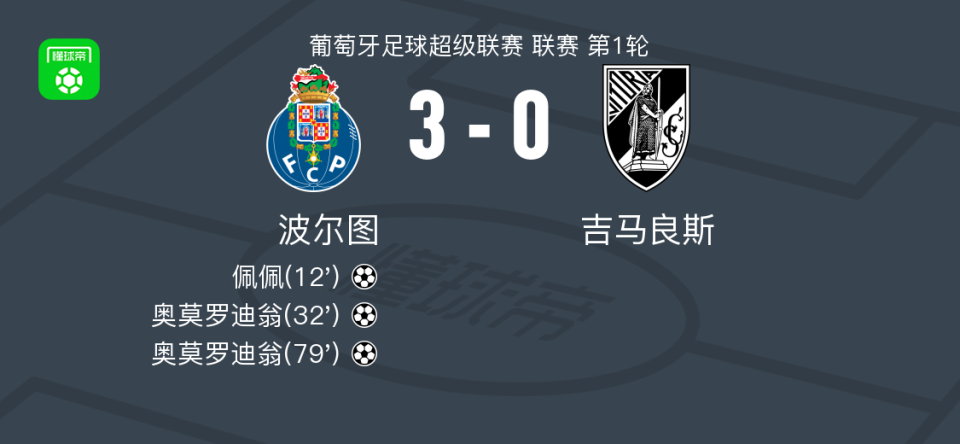 8月12日,葡萄牙足球超级联赛第1轮,波尔图坐镇主场迎战吉马良斯。比赛中,波尔图球员佩佩接博尔哈-赛恩斯助攻率先破门,为球队打开胜利之门。随后,奥莫罗迪翁在阿尔贝托-科斯塔的助攻下再下一城,进一步扩大领先优势。比赛尾声阶段,奥莫罗迪翁再入一球,完成梅开二度。最终,波尔图以3比0战胜吉马良斯,取得新赛季开门红。